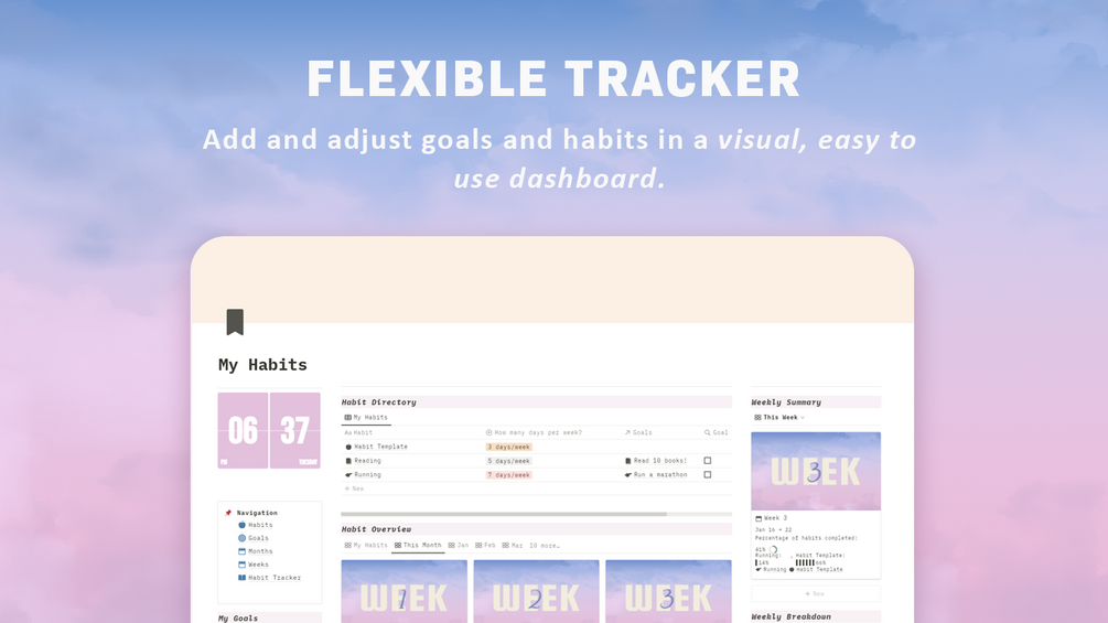 - 📅Complete with 2023 in mind - We've made a template for each week of 2023 so you don't have to! Select the week you're on, and easily add habits for that week!
